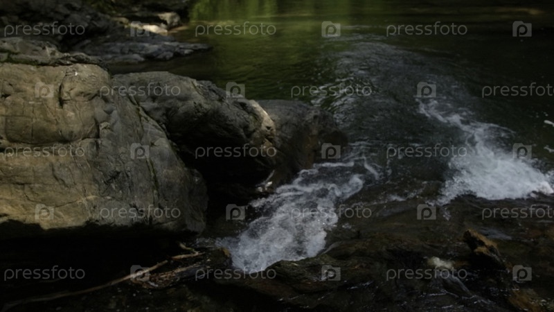 Красивый небольшой водопад и гигантские камни.Креативный.Холодная горная река дикого озера