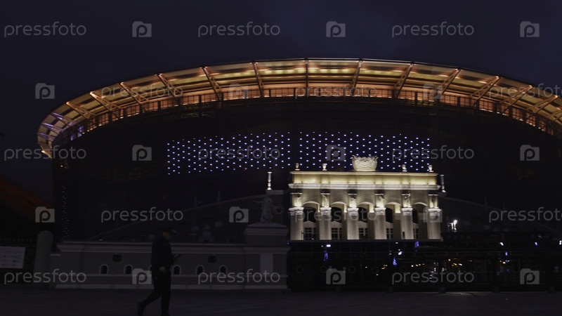 Просветленный ночной город со спортивной ареной и улицей