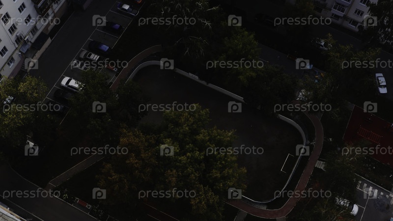 Район с футбольным полем. Скриншоты. Вид сверху старого района города с жилыми зданиями и спортивными полями. Жилой район с футбольным полем во дворе