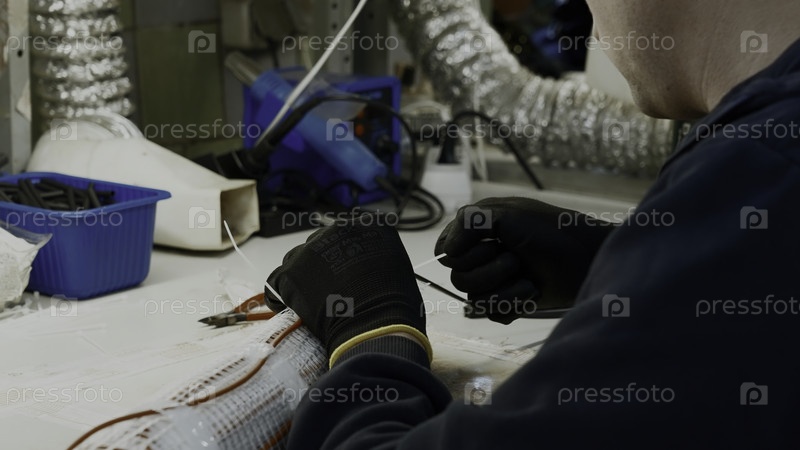 Мастер-электрик, работающий с электрическими проводами.Креативность.Детали мастерской и оборудования