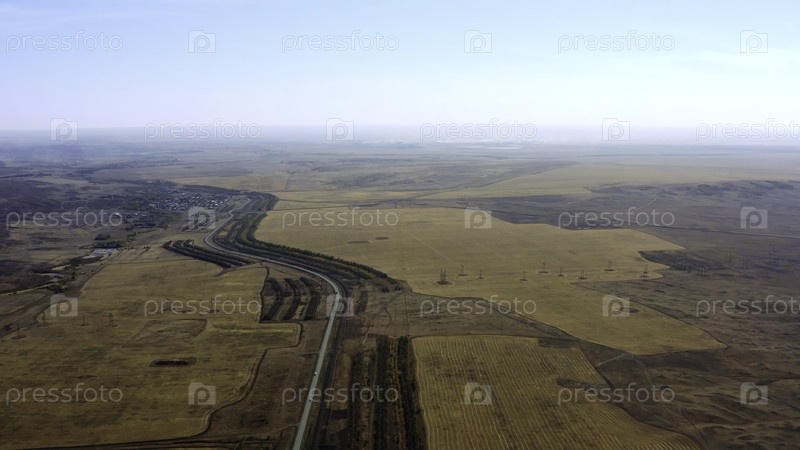 Вид с воздуха показывает обширные равнины со извилистой дорогой, искусственно помещенной в экспансивный ландшафт
