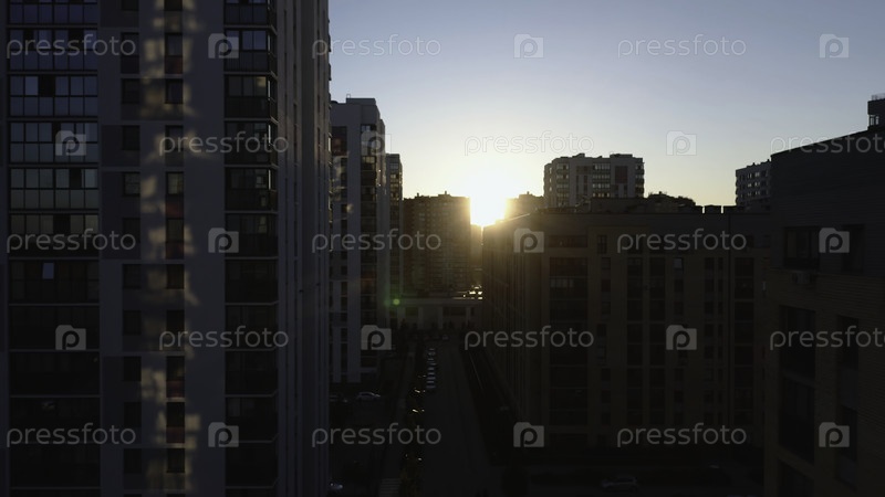 Вид сверху на красивую городскую улицу с ярким солнцем. Скриншоты. Солнечный свет светит по городской улице с жилыми домами. Современный жилой комплекс и район города в солнечное утро