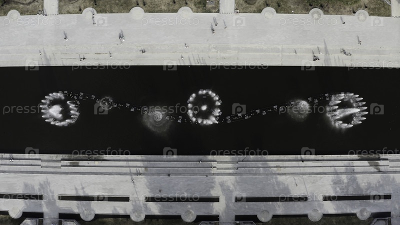 Вид сверху вниз городской набережной и реки с фонтанами
