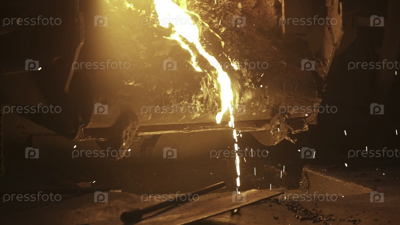 Расплавленный металл разливается, производя яркие искры в оживленной среде литейного завода