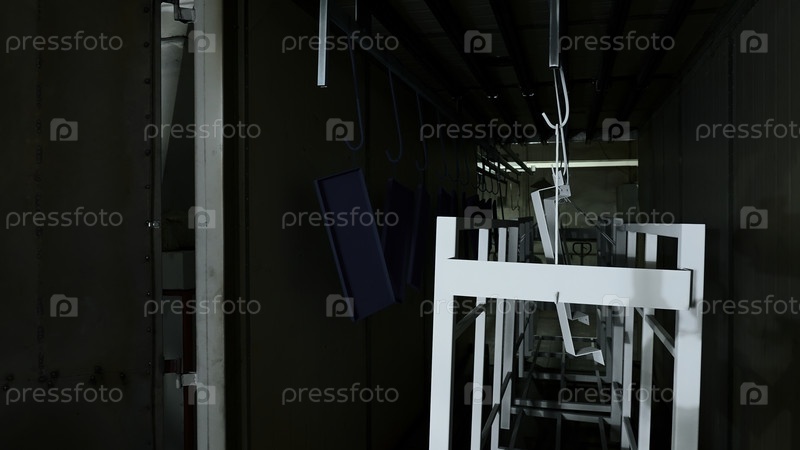 Только что окрашенные детали высыхают после порошкового покрытия.Креативно.Металлические детали в современной красочной мастерской