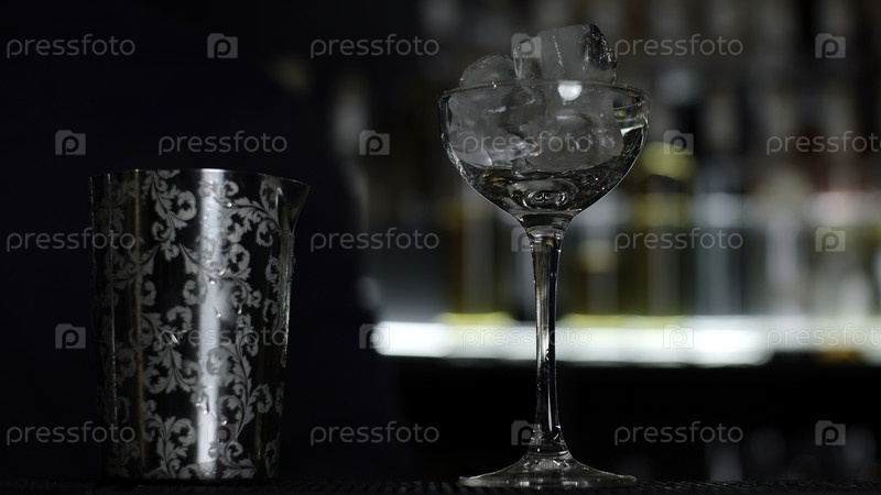 Ближайшее изображение бармена, кладущего кубики льда в маленький пустой коктейльный стакан СМИ Детали приготовления напитка с размытыми бутылками алкоголя на заднем плане