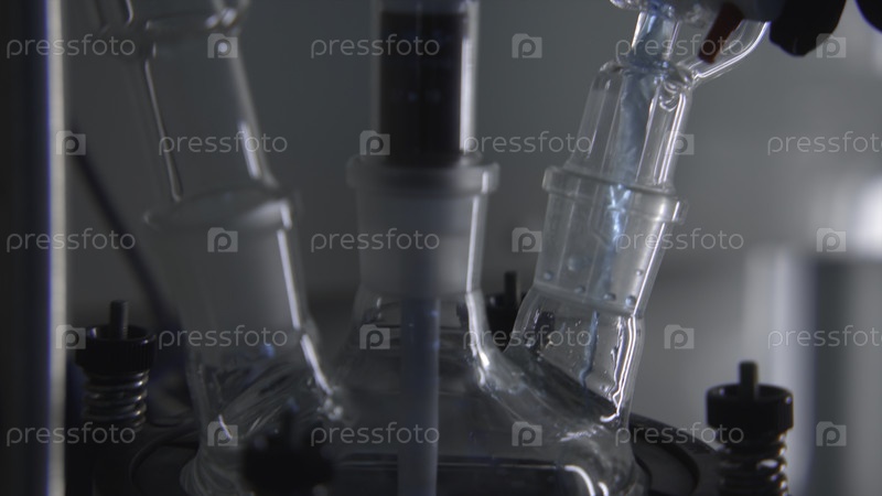 Ближайшее изображение работы с химическими веществами в лаборатории. Фрагменты материалов. Смешивание биохимических жидкостей для лабораторных тестов. Химик смешивает вещества в колбах в лаборатории