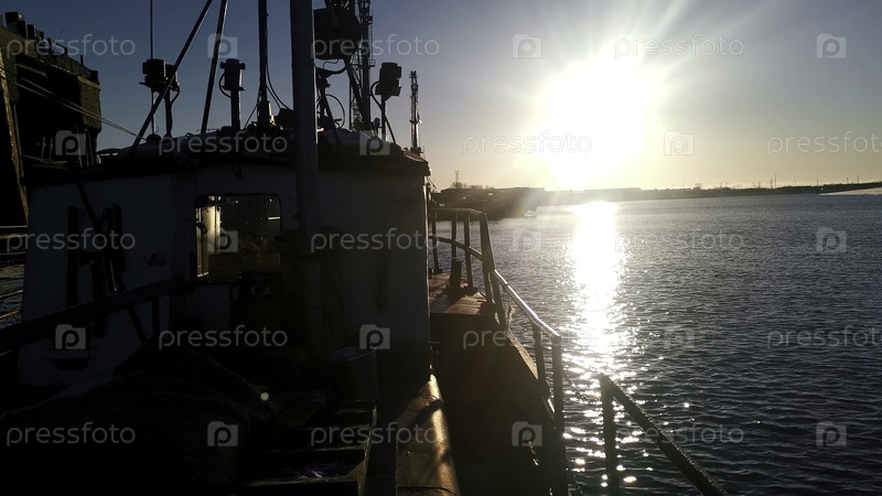 Вид баржевого судна, перевозящего грузы. Клип. Корабль на волнистой реке со светящимся солнцем на фоне