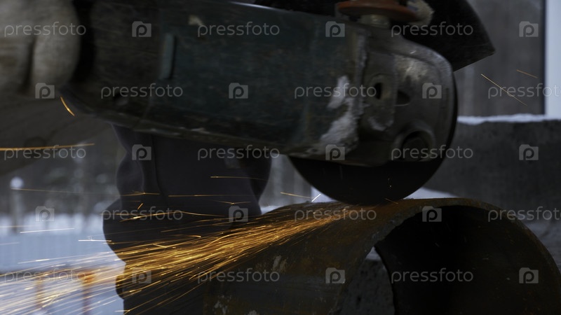 Человек режет металлический кусок трубы с помощью круговой пилы. клип. искры летают из горячего металла, человек усердно работает над сталью