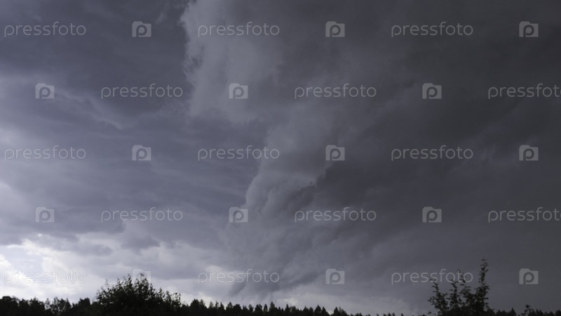 Облачные облака в небе над зеленым лесным лесом. творческий. серое кумулозное облако облачного неба. предстоящая летняя гроза с туманными облаками