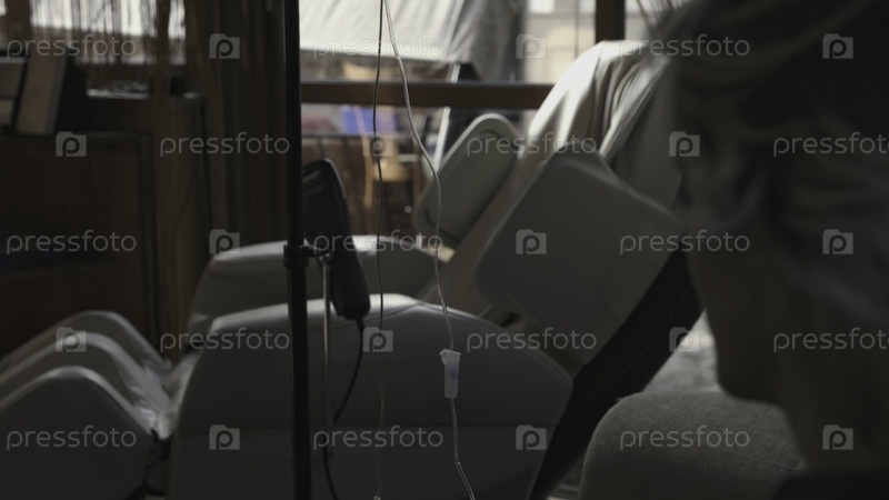 Пустой стул с инфузией.Сток.Молодой человек смотрит на пустый стул с IV-капелькой.Молодой человек печально смотрит на пустую стул умершего пациента