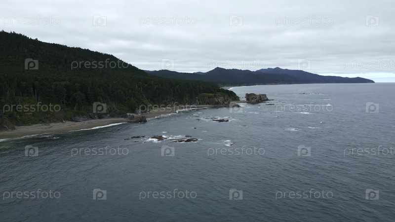 Вид сверху красивого пейзажа лесных гор со скалистым берегом. Клип. Живописный ландшафт зеленого леса и набережной с волнами и камнями. Каменное побережье с зелеными лесами прибрежных гор в пасмурные дни