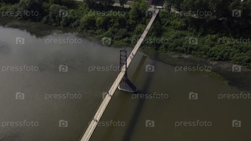 Старый узкий мост над рекой.Клип.Путешествие беспилотника по мосту над широкой грязной рекой