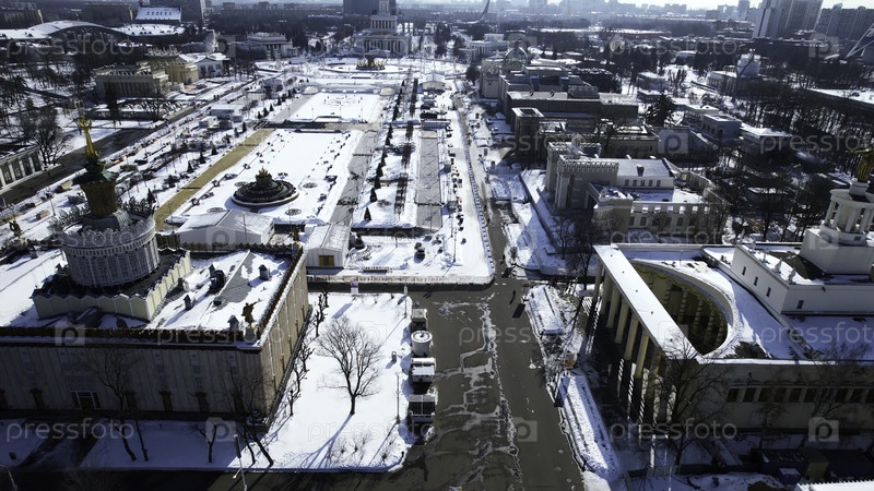 Вид с вершины исторического центра города со площадями и памятниками зимой.Креативность.Долгая аллея исторических памятников и архитектуры города в солнечный зимний день. Длинная площадь с памятниками и историческими зданиями