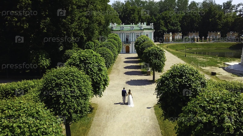 Вид сверху на молодоженов в саду. креативность. пара новобрачных гуляет во дворцовом саду. богатые молодожены в день свадьбы в саду древнего имения