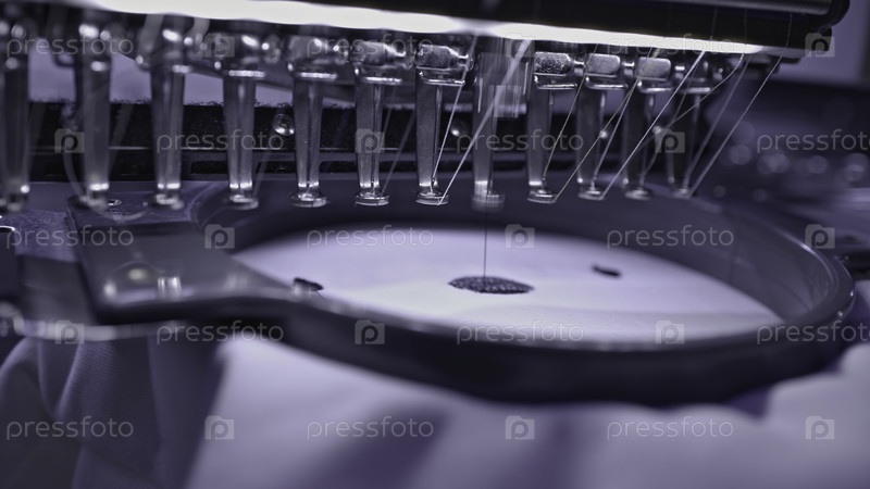 Ближайшее изображение промышленного станка, создающего вышивку на белой ткани. СМИ. Подробности профессионального оборудования