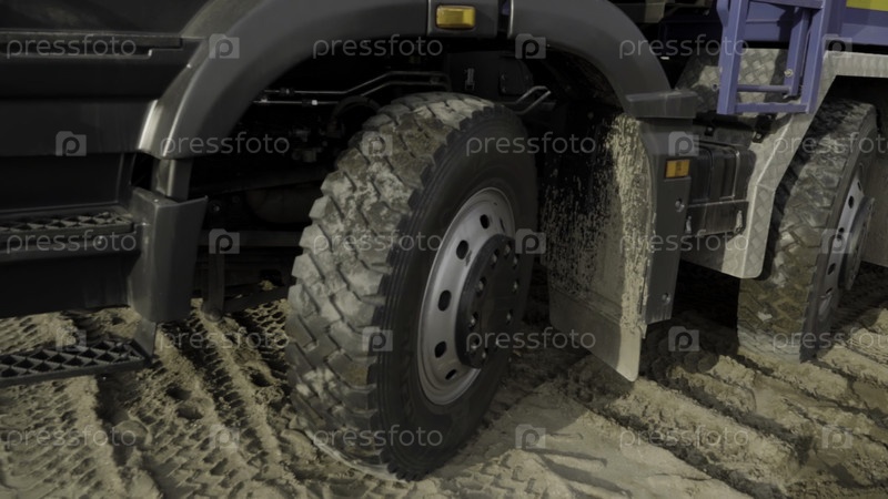 Ближайший снимок колес медленно движущегося грузовика на песчаной поверхности.Сцена.Фон строительной площадки
