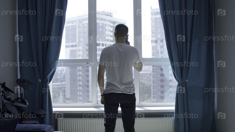 Мужчина в обычной домашней одежде перед окном звонит по мобильному телефону, спокойно общается СМИ. Парень разговаривает на мобильном устройстве в уютной комнате с голубыми шторами