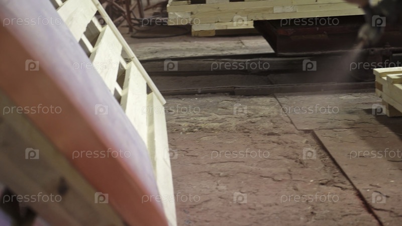 В большом промышленном пространстве деревянные поддоны складываются друг на друга, что выделяет их уникальную текстуру и структурные качества