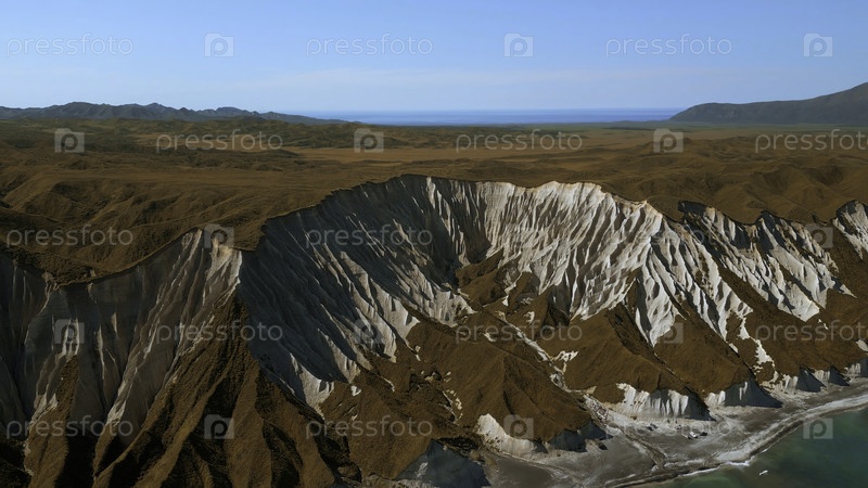 Вид с воздуха на поле желтой травы и красивые скальные образования