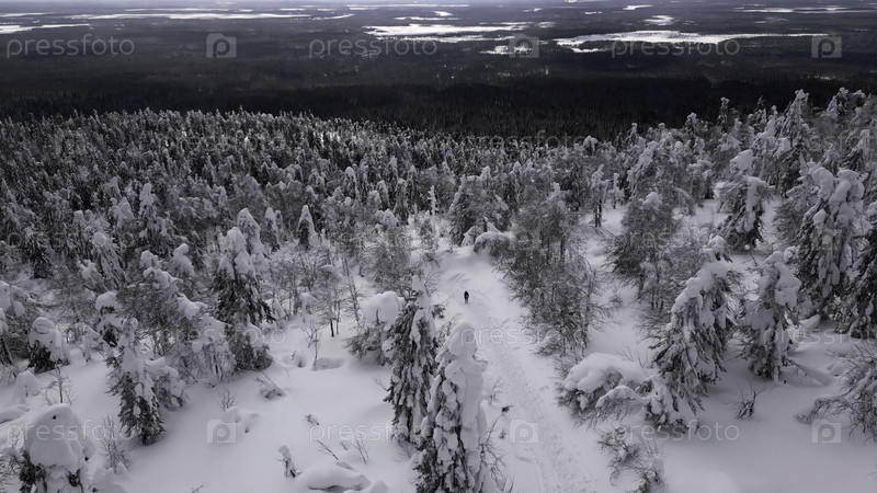Зимние курортные холмы, покрытые снегом в зимний день. Клип. Горный лес и лыжные трассы, одинокий турист, идущий пешком