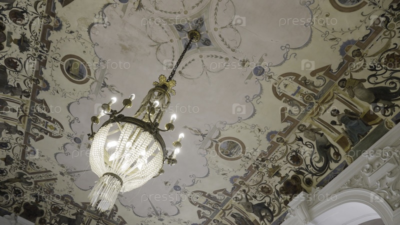 Большой потолок со стеклянной люструшкой.Действие.Окрашенный потолок с искрящейся люстрашей