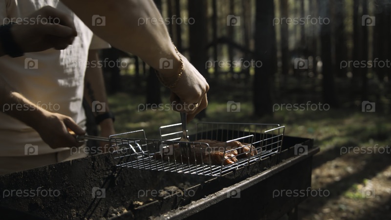 Близкий план мужчин, жарящих курицу на гриле в лесу. Скриншоты. Вкусная цыпленочка-гриль с барбекю в солнечный летний день. Мужчины готовят курицу на гриле и отдыхают в лесу