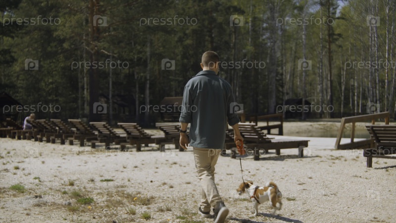 Мужчина гуляет со своей собакой на пляже в лесу.Сток-файлы.Мужчина прогуливается со своей собакой по песку на курорте летом.Мужчина и его собака ходят на берегу пруда в лесу солнечным летним днем
