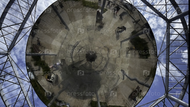 Большое зеркало сверху. Клип. Зеркало в верхней части показывает людей, гуляющих по парку и голубое небо. Высокое качество 4k кадры