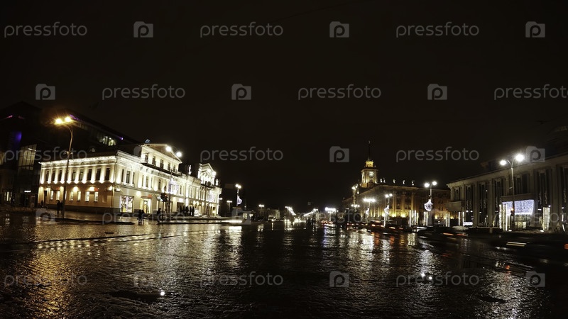 Городской пейзаж в дождливую ночь с красивыми отражениями, блестящими по всей сцене
