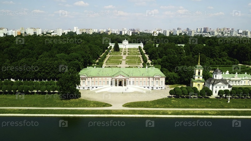 Дворец с прудом на фоне современного города. Креативность. Вид с вершины красивого исторического комплекса в солнечный летний день. Палатовые здания с садом и водоемом с контрастом современного города на горизонте