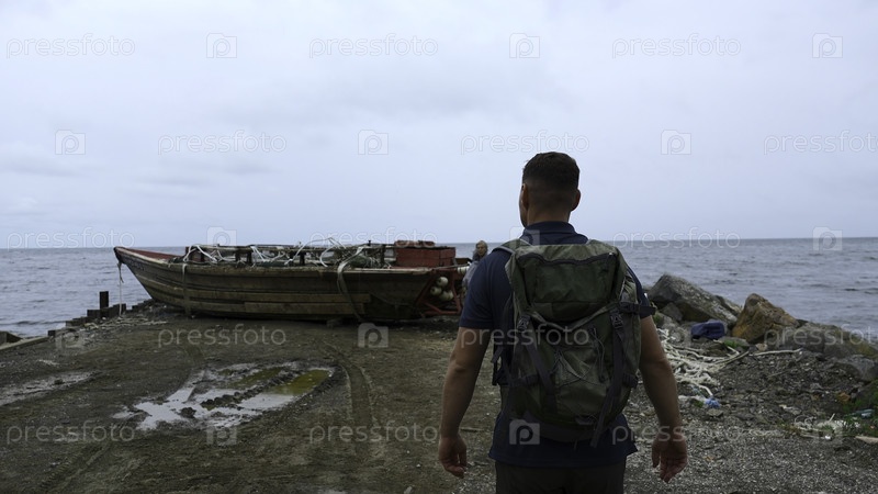 Мужчина идет вдоль пирса к рыбацкой лодке.Клип.Человек на каменном причале идет к рыболовной лодке.Мужчина идет по набережной с рыбацкими катерами в пасмурный день