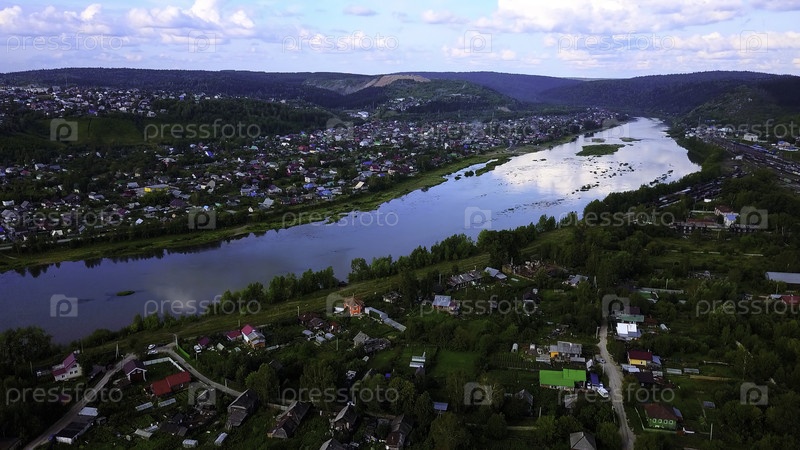 Арийский вид небольшого городка, пересеченного рекой с мостом. Клип. Экологическое место, проживание в сельской местности