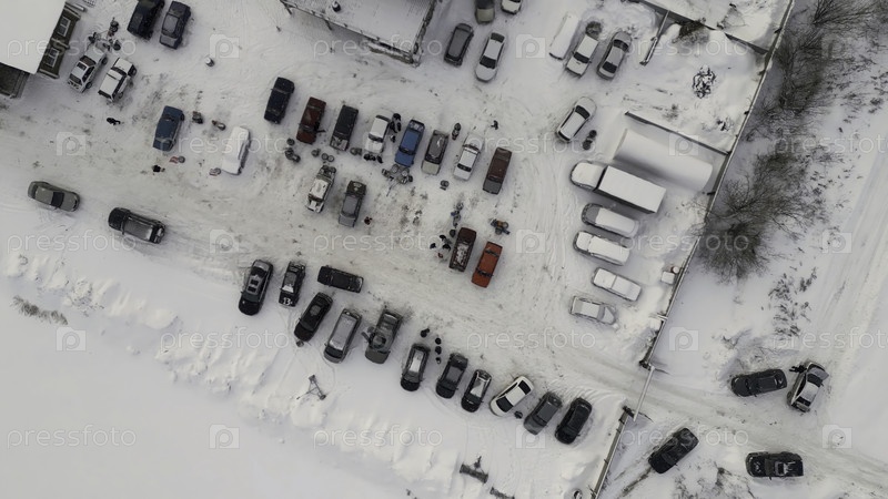 Зимний вид с вертолета.Клип.Стойкие машины во дворе, рядом с которыми люди ходят зимой