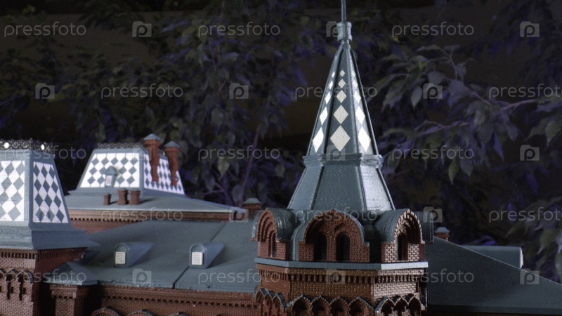 Большая модель Красного дворца. Стоковые кадры. Огромный DIY красивых зданий, снятый на улице рядом с листьями. Высокое качество 4k видео