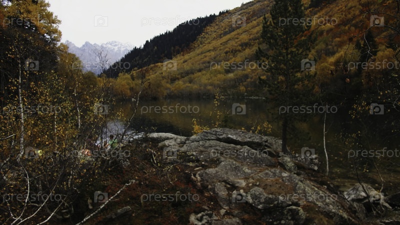Красивое горное озеро с осенним лесом. креативное. красивый осенний пейзаж с горным склоном и озером. горный пруд с густым весом осени в пасмурные дни