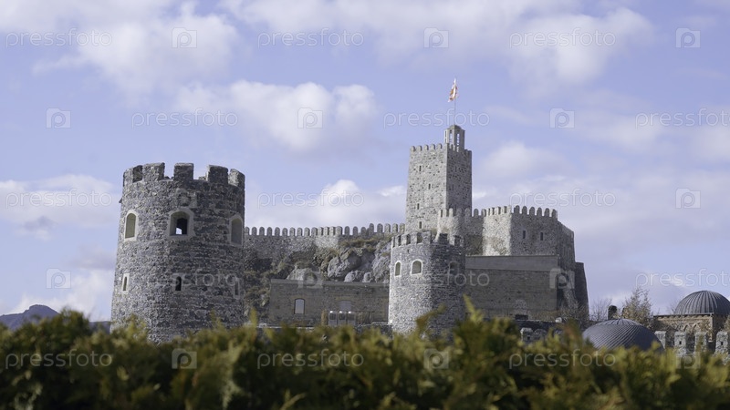 Древняя каменная крепость с башнями. действие. сказочный вид на каменную крепость с башнями в средневековом стиле. красивая каменная крепость со странной средневековой архитектурой летом