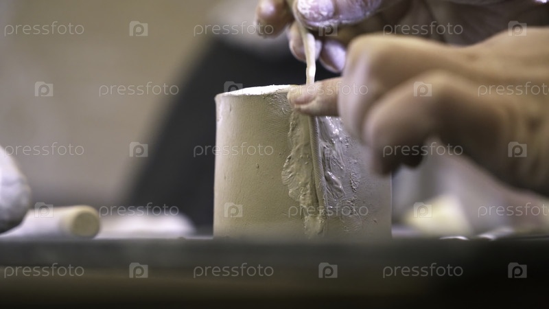 Близкий снимок опытных рук, умело формирующих и изготавливающих глиняные керамические изделия в красивой художественной обстановке студии