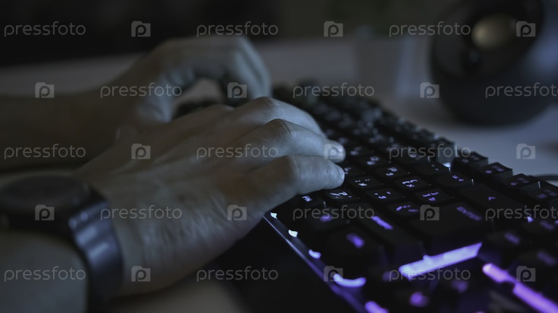 Близкий план мужских рук, печатающих на светящейся клавиатуре. Клип. Мужчина пишет на профессиональной подсветковой клавиатуре. Стильная подсветковая клавиатура для работы или игры в компьютер