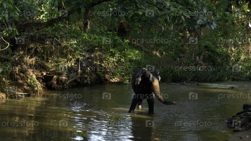 Красивый игривый слон, купающийся в реке. Действие. Тропический зеленый лес и грязная коричневая река