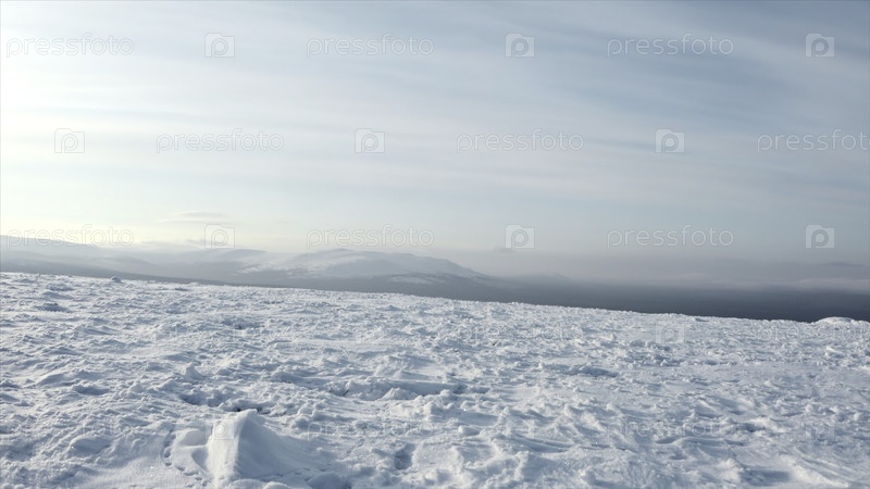 Прекрасный зимний вид на плато и горы на горизонте. Клип. Снежная равнина на вершине платона в солнечный зимней день. Красивый ландшафт зимних гор и холмов в солнечную погоду