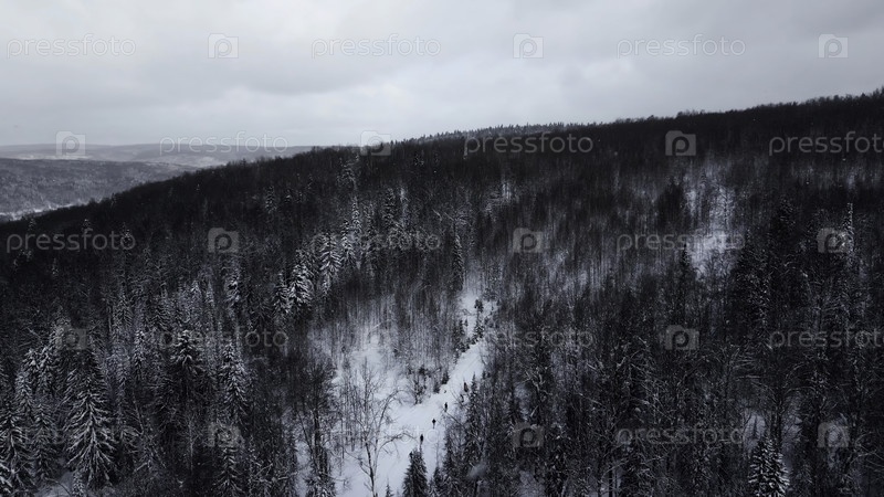 Арктический тундра лес на фоне тяжелого неба. Клип. Аэрофотосъемка арктической тундры и обширного леса, заполненного снежными деревьями