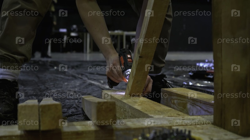 Плотник, работающий на мастерской. СМИ. Рабочий с помощью отвертки для сборки деревянных конструкций