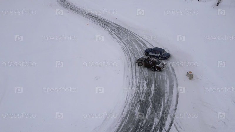 Зимнее веселье, снятое из вертолета.Клип.Зимний дрейф в автомобилях, которые едут на соревнования и люди смотрят вокруг
