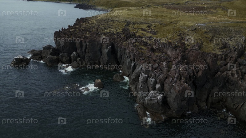 Скалы и ландшафт в Исландии, вид с воздуха. клип. лазурное море и крутой каменный склон берега