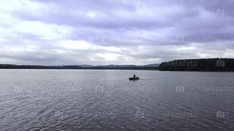 Красивый и спокойный вид на тихое озеро, демонстрирующее драматическое небо и маленькую лодку