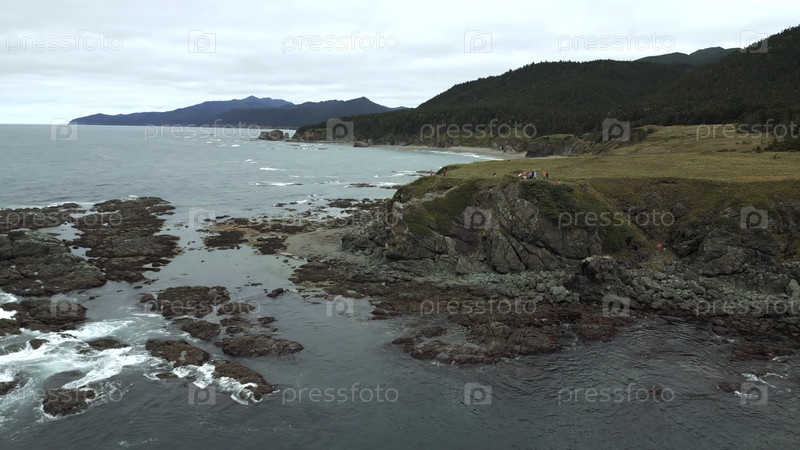 Вид сверху группы туристов на краю морской скалы. Клип. Пешеходы на краю каменистой береговой линии. Туристы на краю скалы на побережье моря в пасмурный день