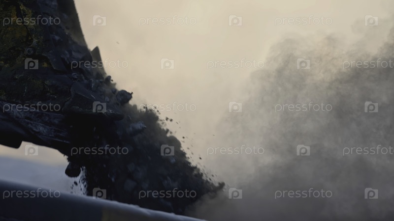 Ближайший снимок экскаватора, выкапывающего полезные ископаемые. Скриншоты из запасов. Кинематическое видео промышленной добычи. Экскаватор подбирает гору добытой руды в карьере
