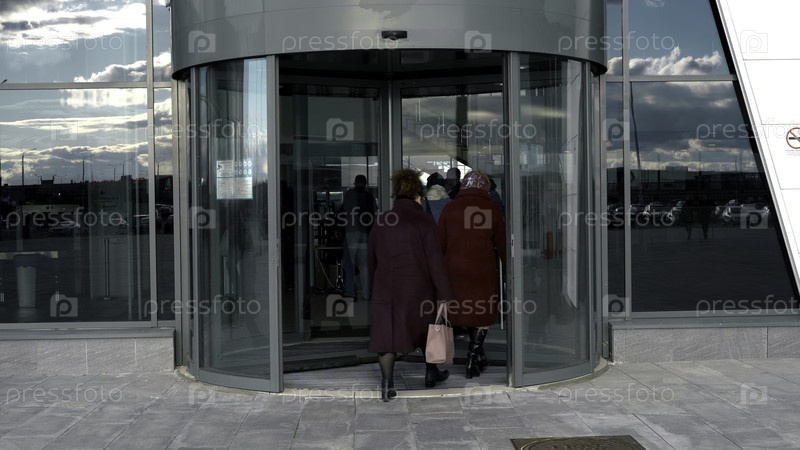 Поворачивающаяся дверь в современном здании, торговом центре.Медиа.Стеклянная вращающаяся дверь, поворотный стол Вход в бизнес-центр, временной пробел