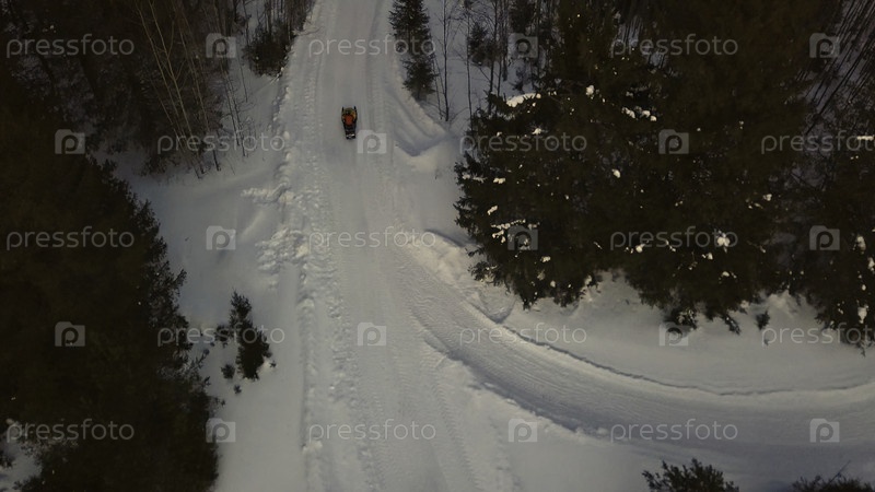 Поездка на снегоходах в лесу в зимний день.Клип.Аэрофотосъемка одинокого путешественника, едущего на снегоходе